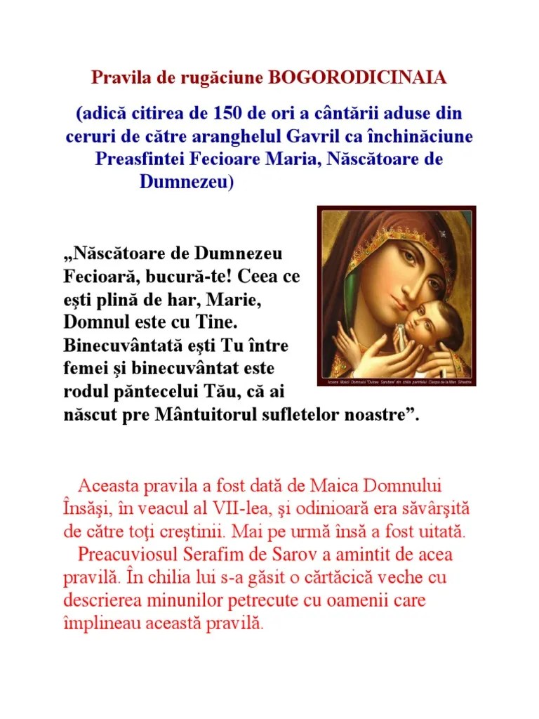 Cu acesta rugaciune nicicand nu vom pieri, in foc nu vom arde, cei... Ceea ce eşti plină de har, marie, domnul este cu tine.. Pravila de rugaciune "bogorodicinaia" (nascatoare de dumnezeu) (adica citirea de 150 de ori a cantarii aduse din ceruri de catre arhanghelul gavriil ca inchinaciune preasfintei fecioare maria, nascatoarea de dumnezeu).