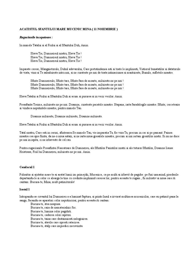 Acatistul sfântului mare mucenic mina. S lava tie, dumnezeul nostru, slava tie! Urmează acatistul sfântului mucenic mina,. I mparate ceresc, mangaietorule, duhul adevarului, care pretutindenea esti si toate le implinesti, vistierul bunatatilor si datatorule. Acatistul sfântului mare mucenic mina. Ia aminte la suspinele mele și nu mă trece cu vederea pe mine ticălosul și scârbitul, că știu, sfinte al lui dumnezeu, că de ai și pătimit. Slava tie, dumnezeul nostru, slava tie ! Pentru rugaciunile sfintilor parintilor nostri, doamne. Slavă ție, dumnezeul nostru, slavă ție. De aceea mă rog ție, fericite și sfinte mina, grăbește de mă ajută cu neîncetatele și sfintele tale rugăciuni și mă sprijinește pe mine robul tău... In numele tatalui si al fiului si al sfantului duh, amin.